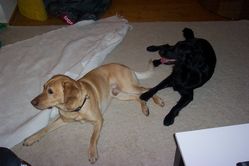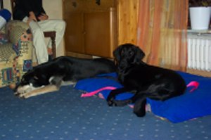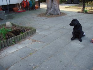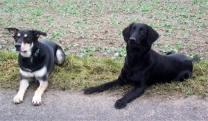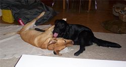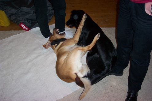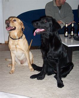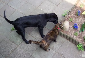 Nebenan wohnt mein Freund Willi. Willi ist ein wunderschöner Labrador-Rüde. Mit ihm durfte ich bereits letztes Jahr im Garten toben, aber da hat er mich wohl noch nicht so richtig ernst genommen. Das ist jetzt aber anders. Er versucht jetzt sogar schon, mich unterzubuttern, aber das lasse ich nicht zu, oder doch? |