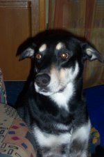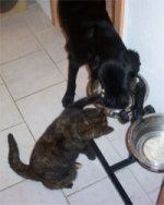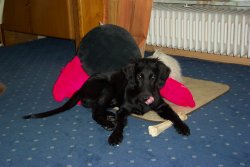 Zu Hause gibt es neben Frauchen und Herrchen auch noch die Katze Randy. Anfangs mochte sie mich gar nicht, aber mittlerweile kommt sie selbst zum Kuscheln zu mir und wir teilen nicht nur die Decke miteinander, sondern ab und zu gebe ich ihr auch einen kleinen Brocken von meinem Fresen ab (meist, wenn Frauchen und Herrchen nicht gucken) |