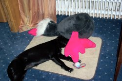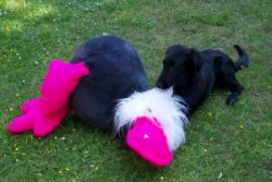 Nach einigem Stöbern in Frauchen alten Spielsachen, habe ich noch diese überdimensional große Ente gefunden. Sie ist zwar größer als ich, aber wer nachher als Sieger rausgeht werden wir noch sehen... |